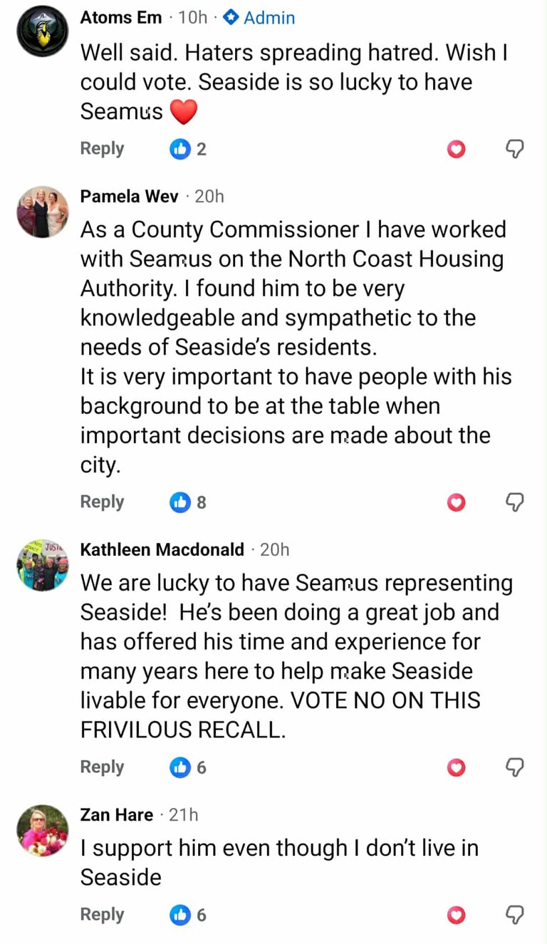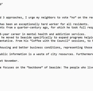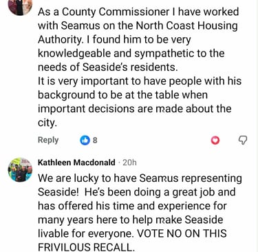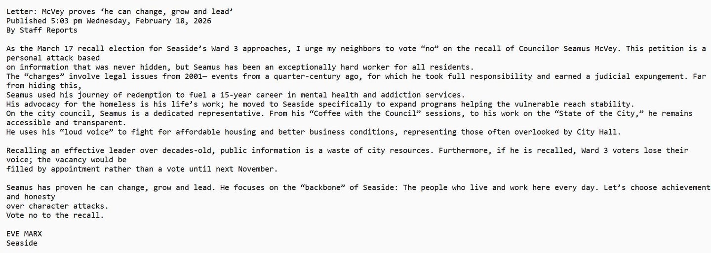 Answer- I could not agree more that second chances are important, and that honesty from elected officials is essential! I also agree that background knowledge is deserved to make informed decisions. That is why I have spent so many years openly sharing my own background, the mistakes I made in it, and how I have worked to not only make amends in my own case, but helped others make the needed changes to grow and improve their own lives. Compiling a list of my personal faults on my own website wasn't necessary when it was already publicly known. To quote the chief recall petitioner's statement in The Daily Astorian, "That McVey was public about his past is irrelevant." This statement says to me that the recall is not a matter of lacking transparency or integrity, but partisan politics and character attacks.